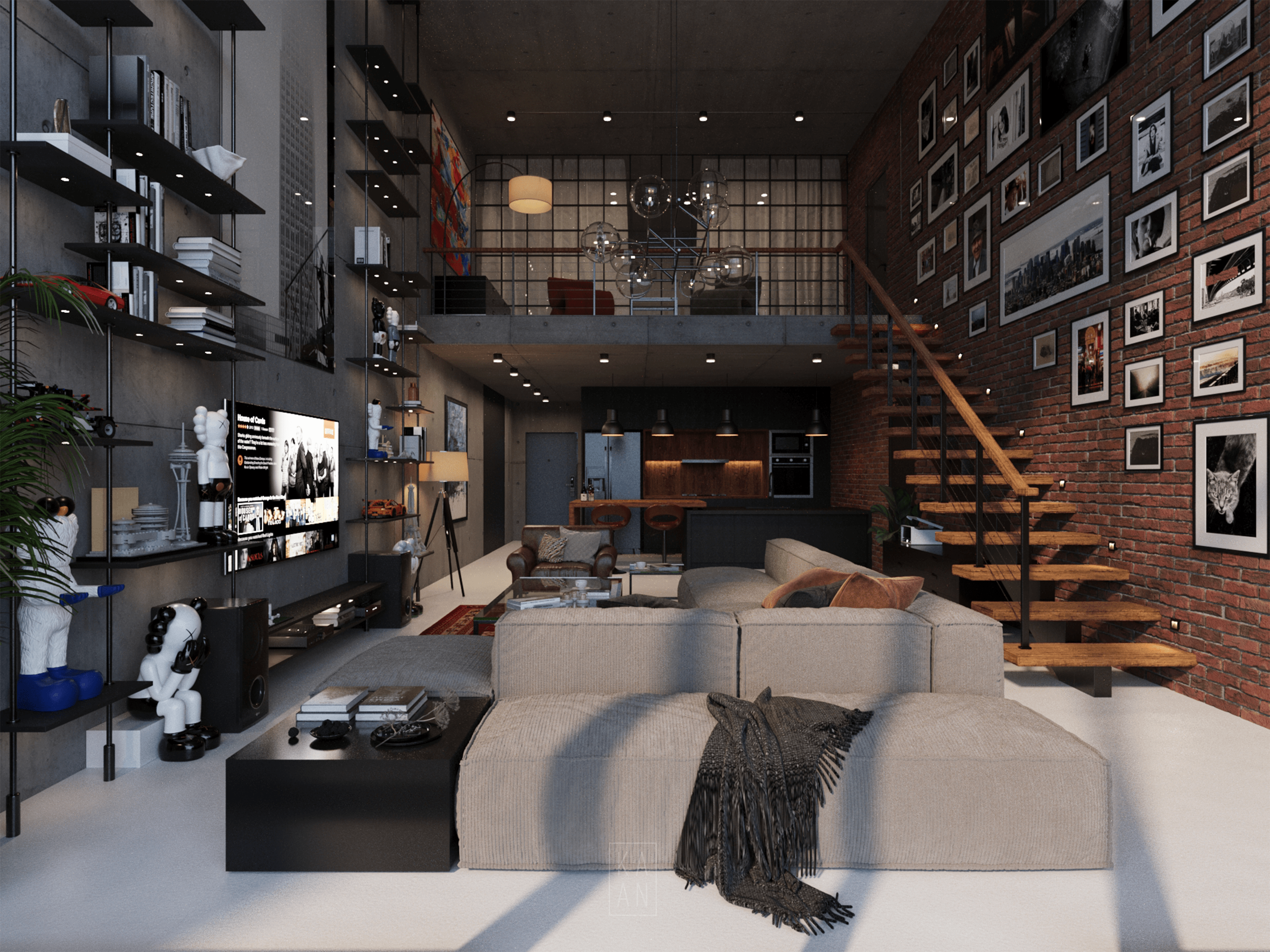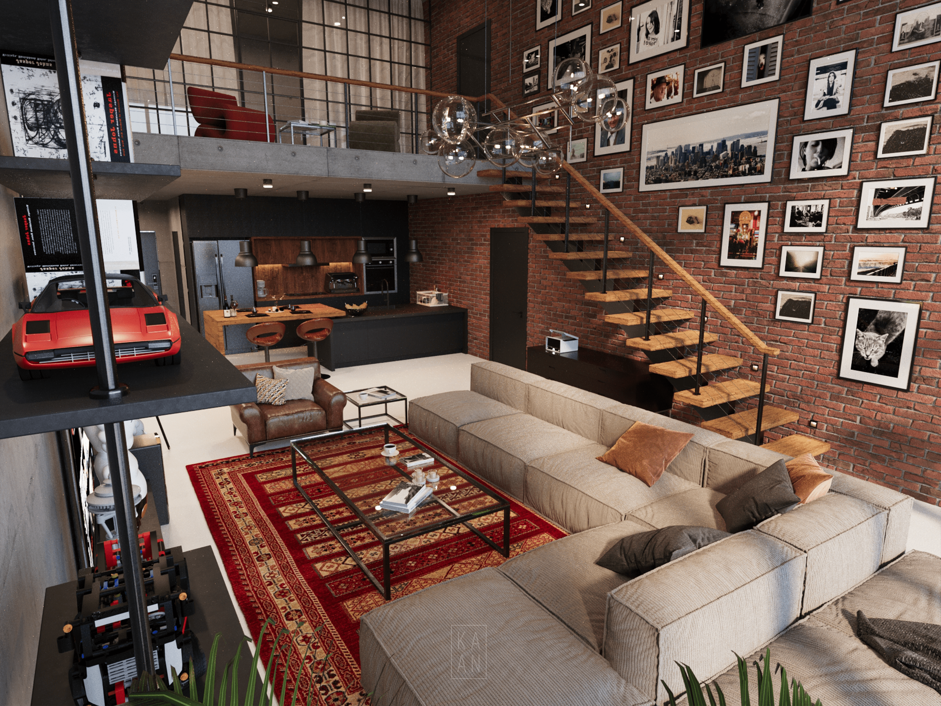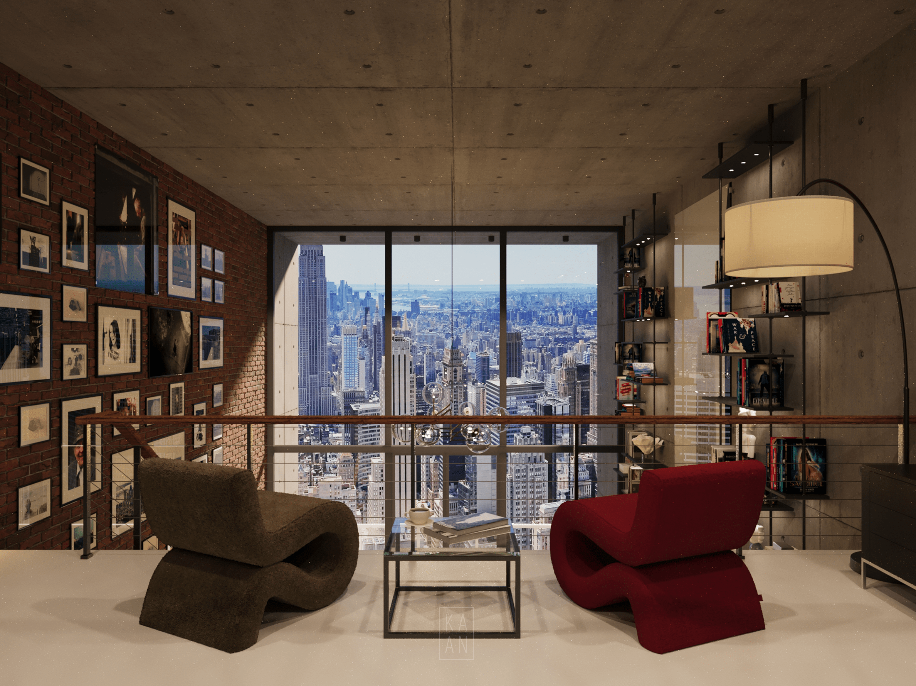 Blending modern urban living with industrial details in the heart of New York City, Skyline Loft draws attention with its large glass facades, raw concrete and brick walls. Designed with a minimalist and eclectic approach, the interior is illuminated by natural light and enriched with warm wood textures and personal artworks. Integrated with an open kitchen and comfortable seating areas, this loft offers a modern and functional living space.